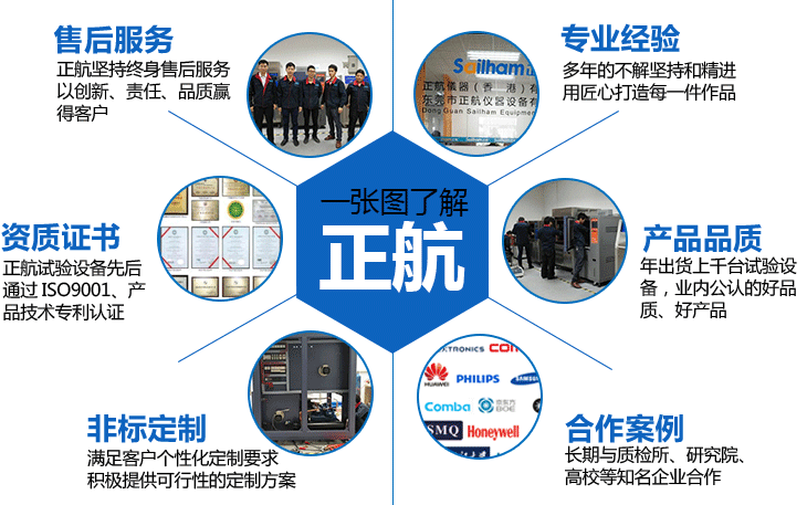 正航儀器設備有限公司是一家致力于各種環境檢測試驗設備研發、設計、制造、銷售服務為一體的專業性企業。并陸續在全國各大城市建立營銷及售后服務網絡。我們合作客戶有質檢所、科研單位、大學、國企、大型企業。設備的精密情、穩定性、售后服務等都有保障。公司不斷精益求精,創造符合多行業可靠性試驗標準要求的優質產品,客戶遍及于電子、電池、TP、半導體、LED光電、塑膠塑料、汽車、軍工、大專院校、航天、科研、計量、質檢、太陽能光伏...等科技產業,從產品研發到售后服務,每一個環節之間都以客戶的觀點與需求作為思考的出發點,專注非標定制。![]() |